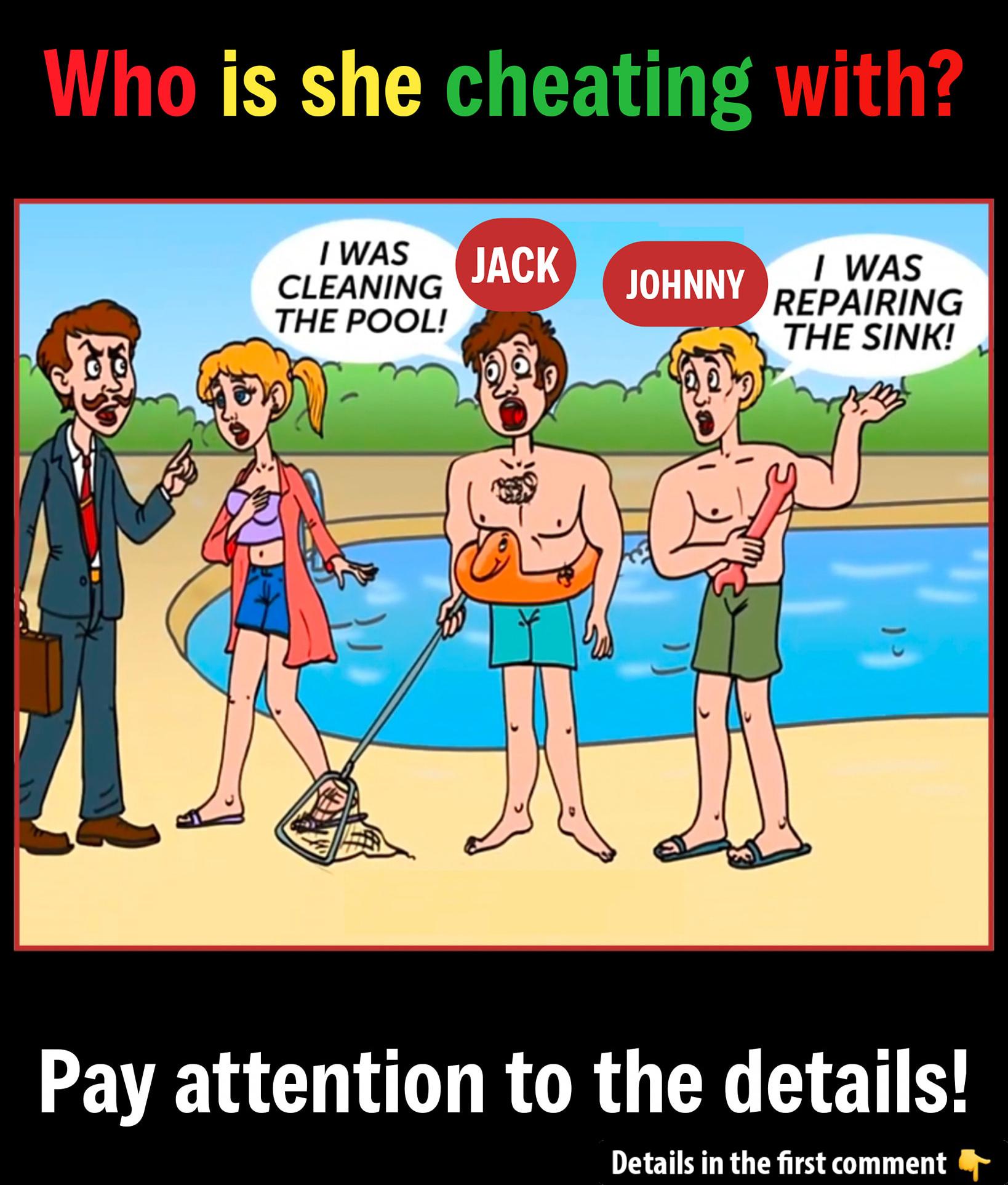Who do you think she’s cheating with—Jack, the pool cleaner, or Johnny, the “handyman”? On the surface, both men appear guilty or innocent. But in puzzles like this, tiny details — outfits, tools, locations — reveal the truth. Can you spot the inconsistencies before reading on?